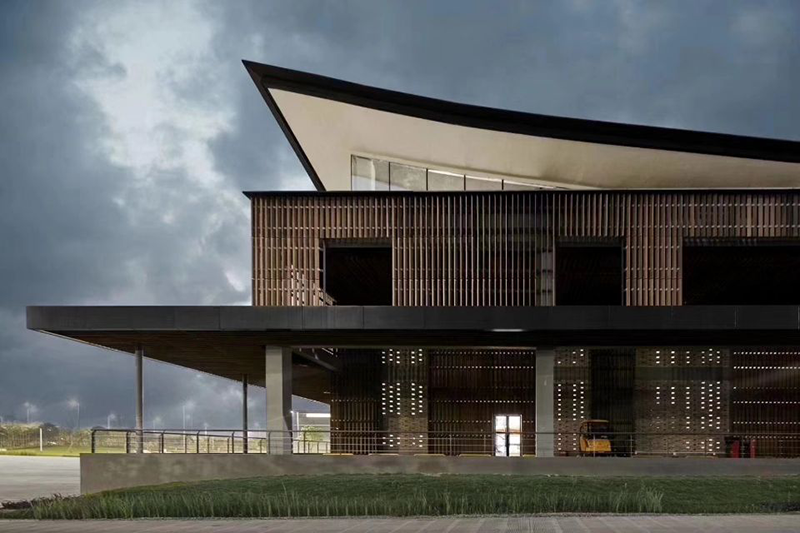 桂林溢達(dá)九美橋(又稱(chēng)十如)時(shí)尚園位于桂林市象山區(qū)九美橋一帶,是香港溢達(dá)集團(tuán)承債式整體重組桂林銀海紡織集團(tuán)公司后實(shí)施的綠色工廠項(xiàng)目。項(xiàng)目外墻、欄桿和天花吊頂使用的環(huán)保竹木格柵兼來(lái)自于桃花江竹材,顏色厚重雅致,質(zhì)感天然,疏密有致,既美觀又充分彰顯了綠色環(huán)保、低碳節(jié)能和可持續(xù)發(fā)展的理念。