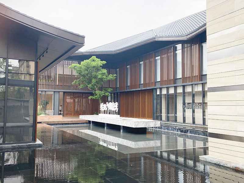綠地·明鏡灣文旅小鎮(zhèn)位于江西省宜春市靖安縣城南部,毗鄰禪宗馬祖道場法藥寺與霽峰塔原址,潦河環(huán)抱明鏡灣小鎮(zhèn)緩緩流過。小鎮(zhèn)規(guī)劃建設(shè)占地面積 468 畝,總建筑面積約50萬㎡。集合了民宿、低密住宅、特色商業(yè)、酒店、文化、旅游和康養(yǎng)七位一體的明鏡灣小鎮(zhèn),不僅滿足了本地居民的消費需求,更極大地推動了當?shù)芈糜螛I(yè)的發(fā)展。明鏡庭作為小鎮(zhèn)的展示中心,設(shè)計凝縮小鎮(zhèn)生活化禪修之旅的構(gòu)思,整體體現(xiàn)了東方禪的“清、凈、和、美”。入口的空心門柱和門欄頗具禪意,大量桃花江高碳防腐竹格柵看似隨意,實則精心的搭配,與禪學(xué)一空萬有的理念一拍即合,于形簡意切中,融入本真世界。幕墻立面也采用桃花江竹材的方竹格柵,和石材、玻璃等材質(zhì)一起整體闡釋禪意與佛性,富有韻律地舒展細膩的現(xiàn)代質(zhì)感,演繹著中國山水的朦朧意境。